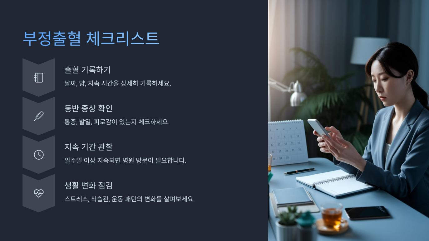 부정출혈 기간에 어떻게 대처하느냐에 따라 이후 건강 상태가 크게 달라질 수 있습니다. 다음과 같은 체크리스트를 통해 증상을 기록하고, 적절한 의료 상담을 받을 수 있도록 하세요.