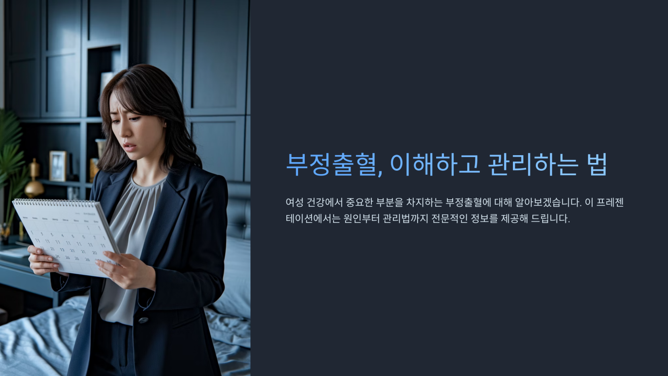 안녕하세요. 여성 건강에 대한 전문적인 정보를 전해 드리는 블로그를 찾아주셔서 감사합니다. 오늘은 많은 분들이 한 번쯤은 겪거나 들어본 적이 있을 “부정출혈”에 대해 이야기해보려고 합니다. 흔히 월경 주기와 무관하게 발생하는 질 출혈을 부정출혈이라고 부르는데요, 여성이라면 누구나 겪을 수 있어 더욱 꼼꼼한 정보가 필요합니다. 특히 부정출혈 기간과 관련된 여러 궁금증, 이를 이해하고 대처하는 방법에 대해 깊이 있는 내용을 준비했습니다.