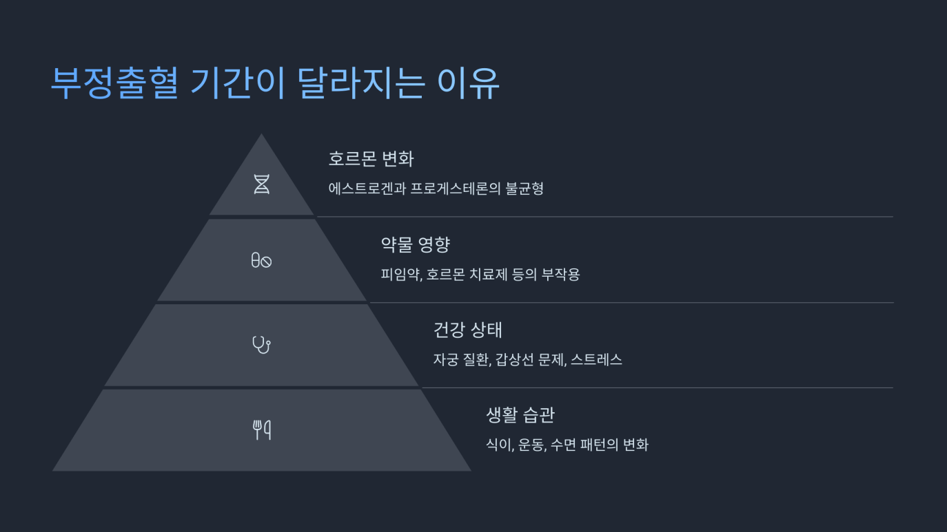 스트레스는 생각보다 우리의 호르몬 균형과 생식 건강에 큰 영향을 미칩니다. 극심한 스트레스를 오래 받으면 생리 주기가 불규칙해질 뿐 아니라, 갑작스러운 출혈이 발생할 수도 있습니다. 특히 만성 스트레스는 호르몬 축의 교란을 불러오므로 부정출혈 기간이 예측하기 어려울 정도로 변동될 수 있습니다. 이 밖에도 급격한 체중변화, 무리한 운동, 수면 부족 등도 부정출혈의 기간과 빈도에 영향을 끼칩니다.