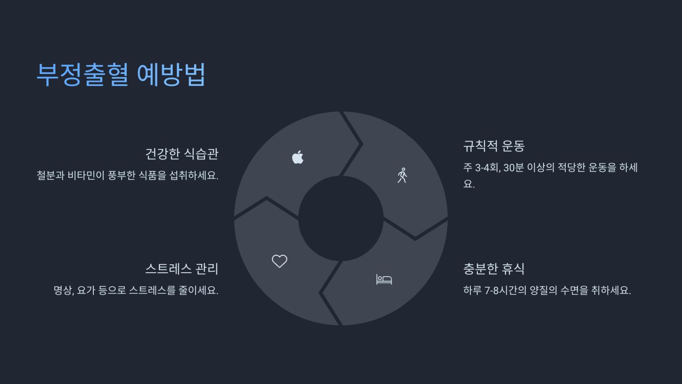 부정출혈을 예방하거나 그 기간을 단축하기 위해서는 평소에 균형 잡힌 생활습관을 유지하고, 주기적으로 자신의 몸 상태를 점검하는 것이 중요합니다.