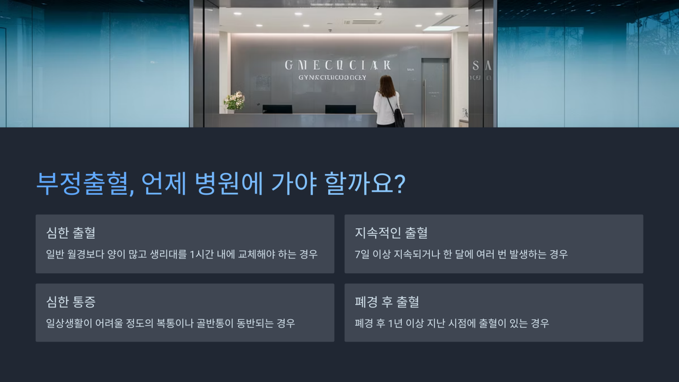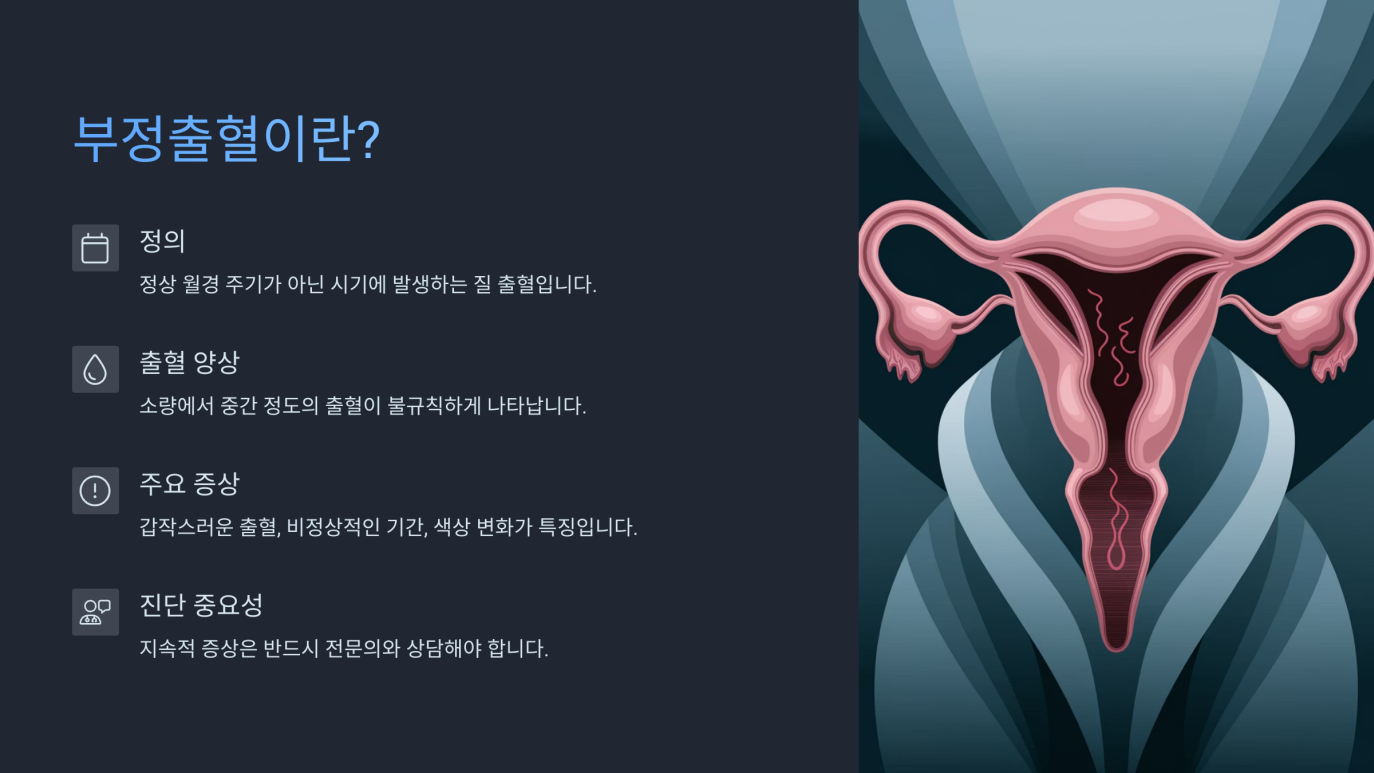 - 주의할 점: 가벼운 부정출혈이라 해도 무시하거나 방치하면 원인 질환이 악화되거나 장기적인 건강 문제로 이어질 수 있습니다.