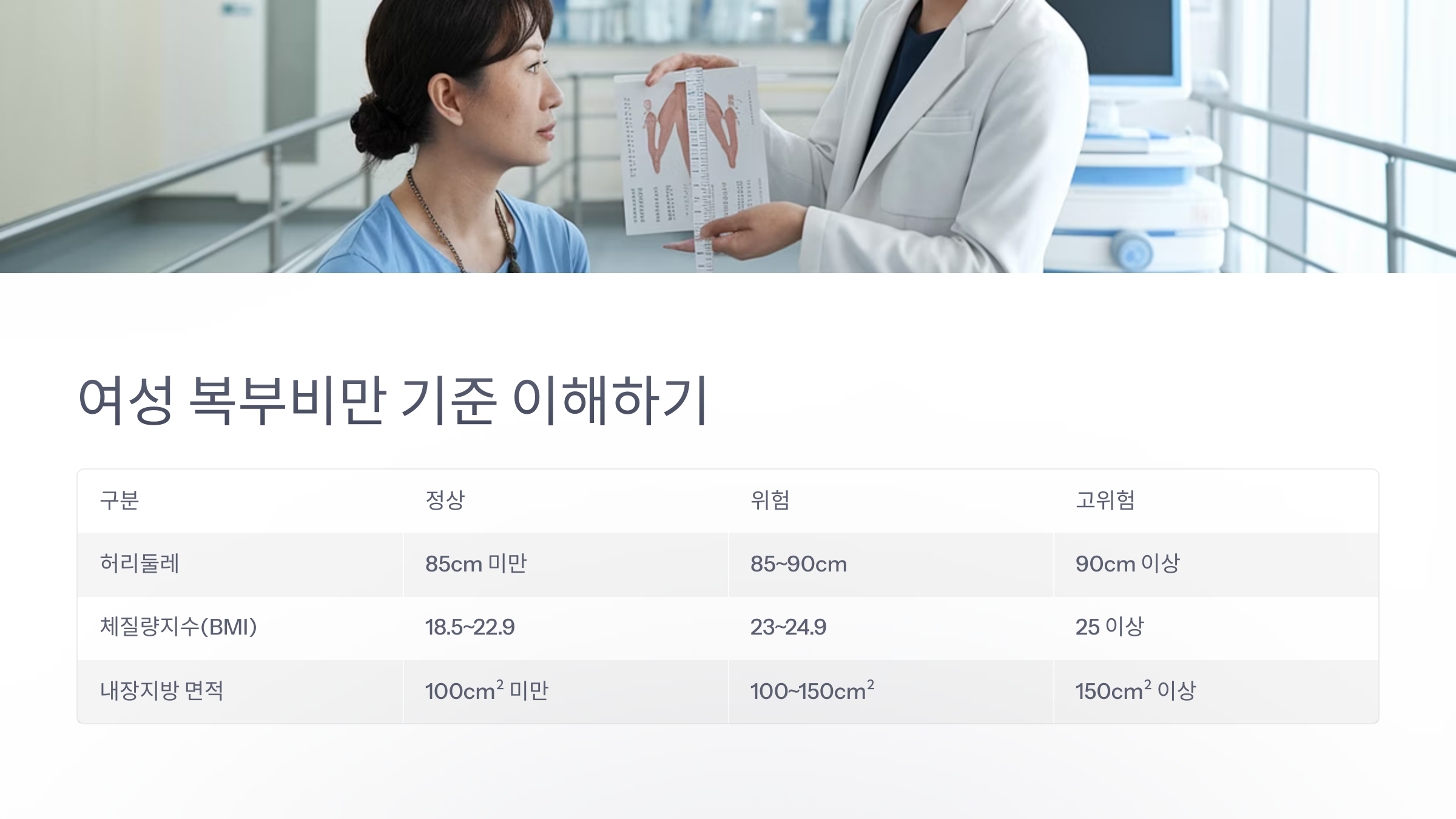 즉, BMI 지수가 낮거나 적정 구간에 있어도 “여자 복부비만 기준”에 따라 허리둘레가 85cm 이상이면 건강 위험도가 올라갈 수 있음을 기억해야 합니다.
