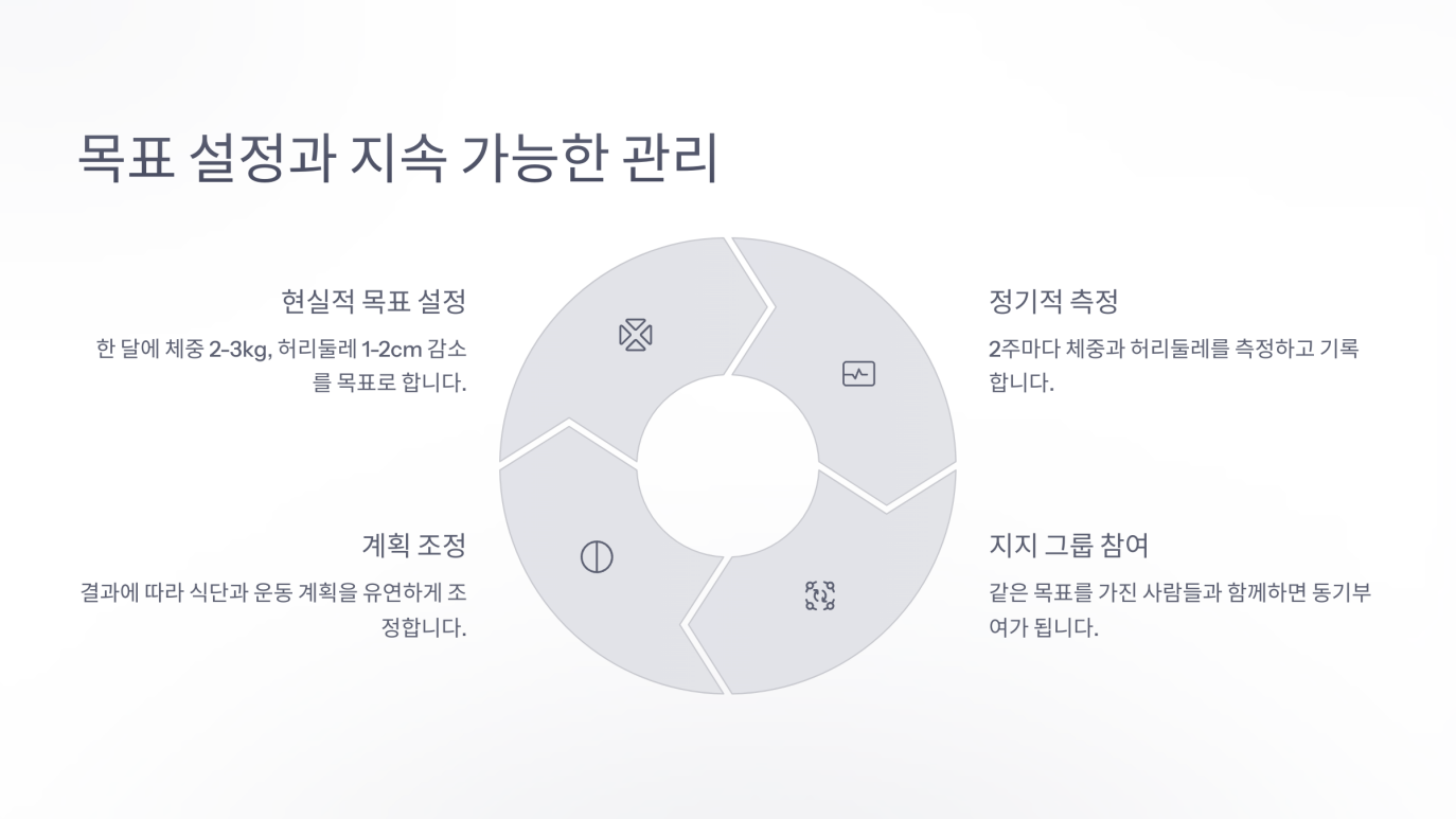 - 주기적 점검: 허리둘레와 체중 변화를 기록하고, 한 달 단위로 리뷰하는 습관을 길러보세요.
