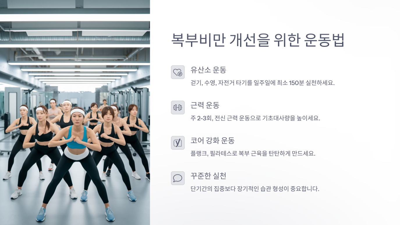 - 하체 근력 운동: 스쿼트, 런지 등 하체 근육은 기초대사량을 올려 복부비만 해소에 큰 도움을 줍니다.