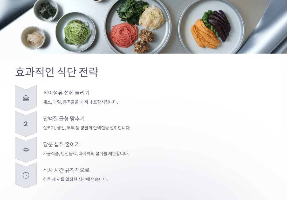 - 하루하루의 작은 실천: 물 충분히 마시기, 제때 식사하기, 활동량 늘리기 등을 반복하면 생활 패턴 자체가 달라집니다.