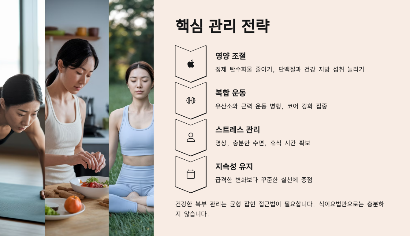 - 마음 관리: 체중 감량 목표 달성 후 ‘이제 괜찮겠지’라는 안일함은 금물. 스트레스와 감정 기복을 잘 관리해야 복부 지방 재축적을 예방할 수 있습니다.