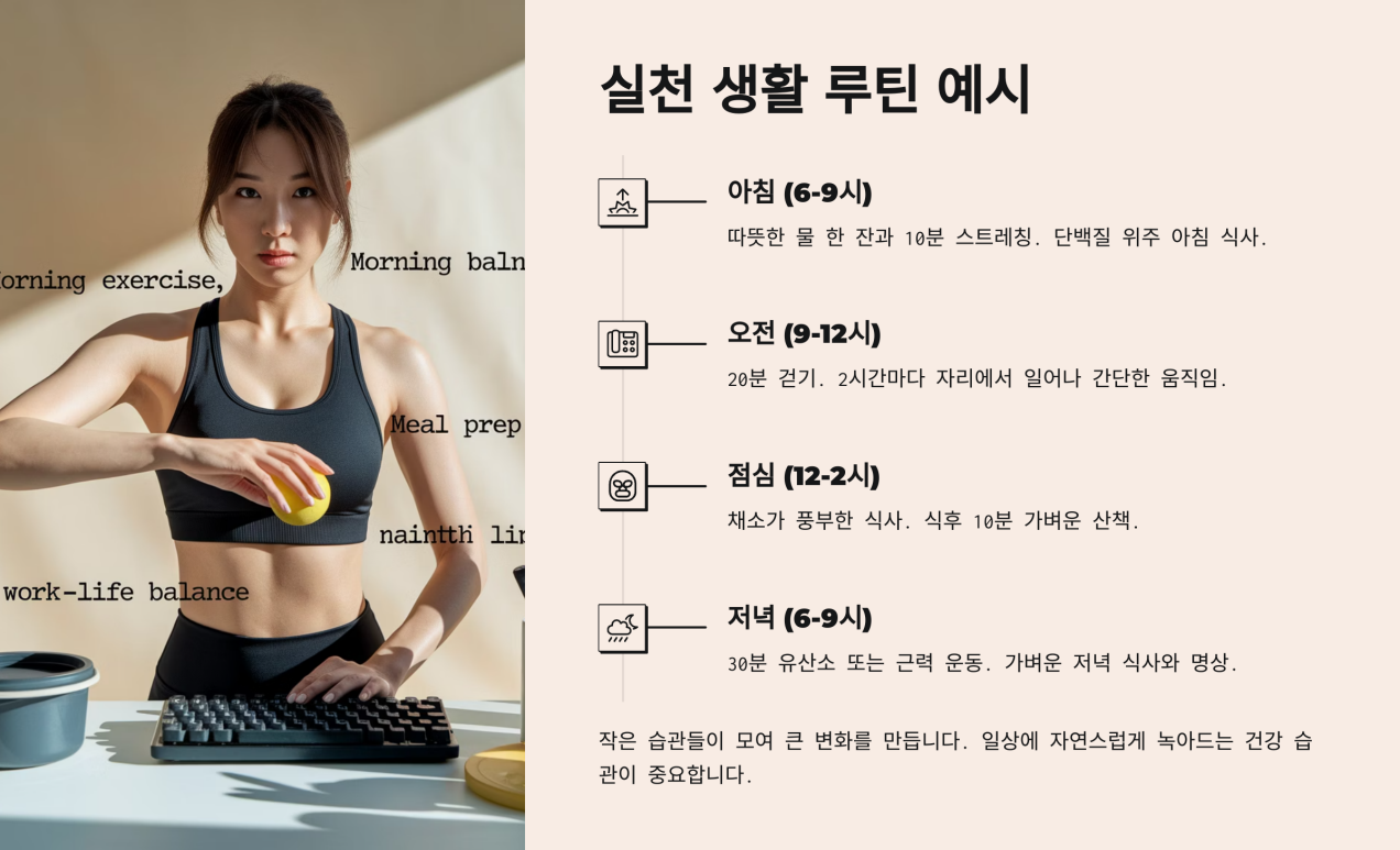 - 점심 전후: 업무 중 1시간에 한 번씩 자리에서 일어나 가벼운 전신 스트레칭이나 계단 오르내리기.