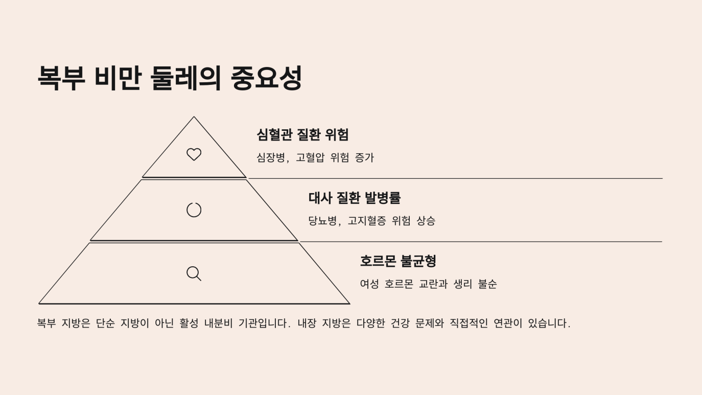 여자 복부 비만 둘레는 단순히 ‘뱃살’ 문제로만 치부하기에는 상당히 중요한 건강 지표입니다. 허리둘레 85cm 이상부터는 고혈압, 당뇨, 고지혈증 등 대사증후군 위험이 높아지고, 이는 심혈관 질환으로 이어질 수 있습니다.