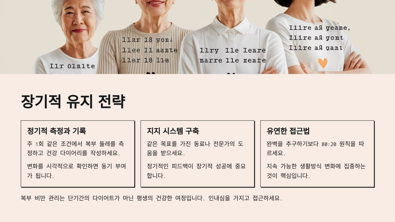 이러한 라이프스타일 변화를 4주 이상 꾸준히 실천하면, 여자 복부 비만 둘레가 서서히 감소하는 변화를 느낄 수 있을 것입니다.