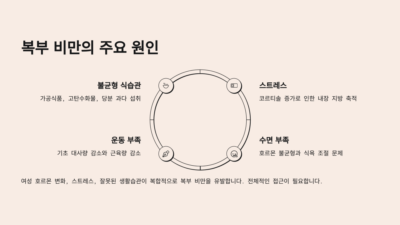 한국여성정책연구원에서 2025년 발표한 조사에 따르면, 여성의 스트레스 지수가 과거보다 20% 이상 상승했다는 통계가 있습니다. 스트레스는 식욕을 불균형하게 만들고, 동시에 코르티솔 호르몬 분비를 촉진하여 복부 지방 축적을 유도합니다. 또한 수면이 부족하면 식욕 조절 호르몬(렙틴, 그렐린)의 분비가 흔들려 과도한 식이 섭취를 유발하기도 합니다.