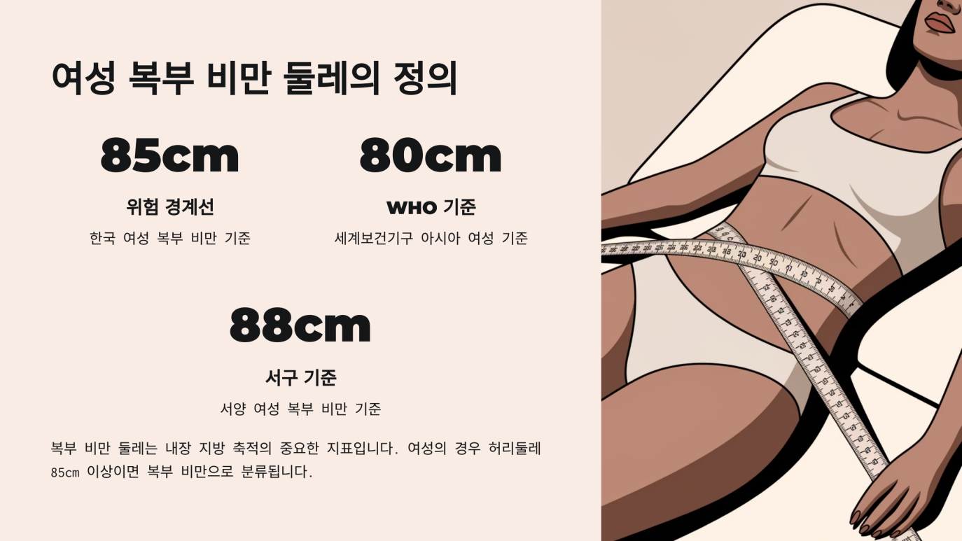 여자 복부 비만 둘레는 간단히 말해 여성의 허리둘레가 비만 판정 기준치를 초과한 상태를 말합니다. 일반적으로 우리나라 보건 당국과 세계보건기구(WHO)에서는 남녀별 허리둘레 기준을 제시하고 있으며, 여자 복부 비만 둘레는 허리둘레가 85cm 이상(대한비만학회 기준, 2025년 수정판)일 때를 의미합니다. 이 수치는 단순히 미용적 문제를 넘어서, 비만으로 인한 대사 이상을 가늠하는 핵심 지표이기도 합니다.
