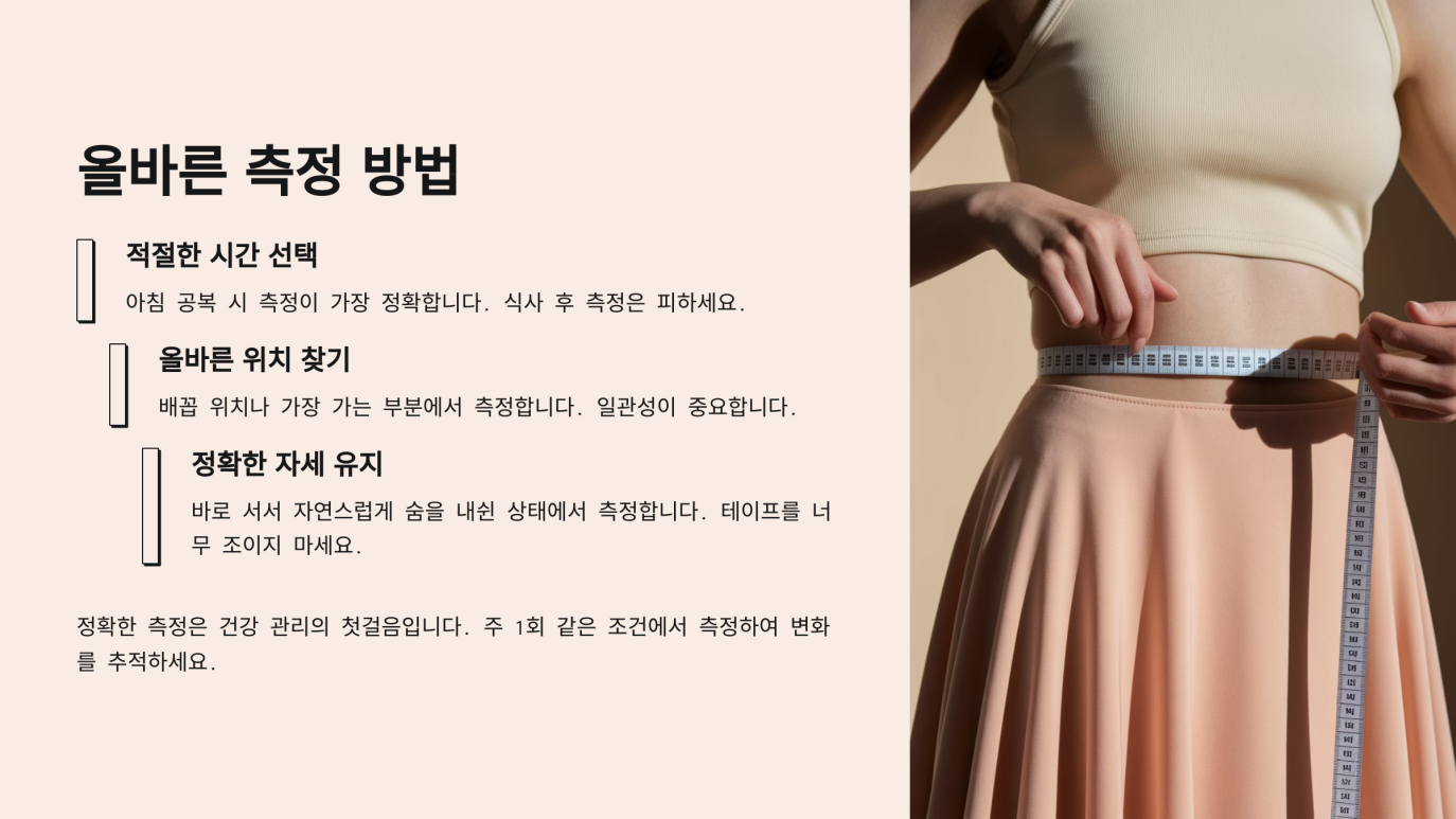 - 측정 부위: 갈비뼈 가장 아래 부분과 골반뼈의 윗부분(장골능) 사이, 즉 허리의 가장 가느다란 부분을 재야 합니다.