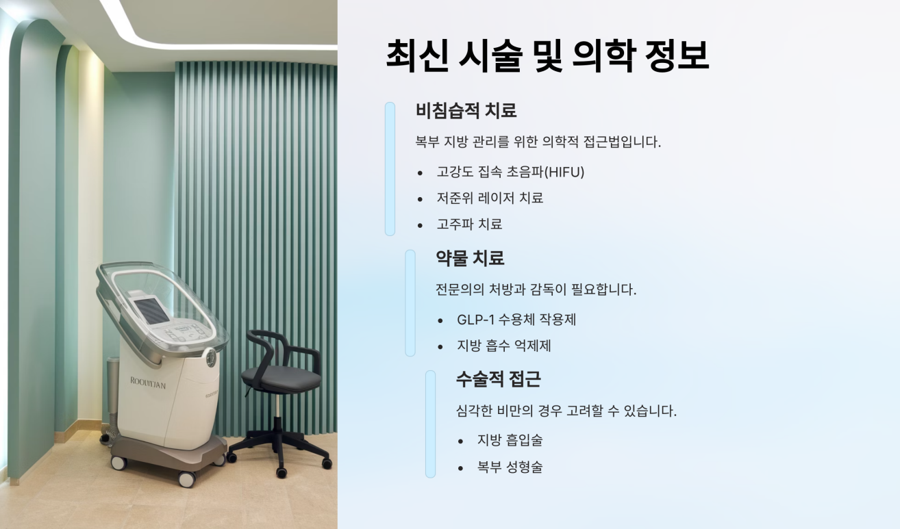 - 냉동 지방 분해(쿨스컬프팅): 지방세포를 저온에서 얼려 자연 배출을 유도하는 비침습적 시술로, 국소 부위 복부비만에 효과적인 것으로 알려져 있습니다.