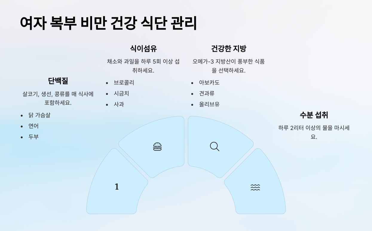 - 포화지방 대신 불포화지방(올리브유, 아보카도, 견과류)을 적절히 사용하여 심혈관계 위험을 낮추고, 여자복부비만 건강을 유지하도록 도와줍니다.