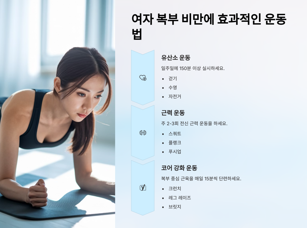 - 스쿼트, 런지, 플랭크, 푸시업 등의 전신 근력 운동을 통해 복부뿐 아니라 전신 근육을 강화해 여자복부비만 건강을 종합적으로 관리하세요.