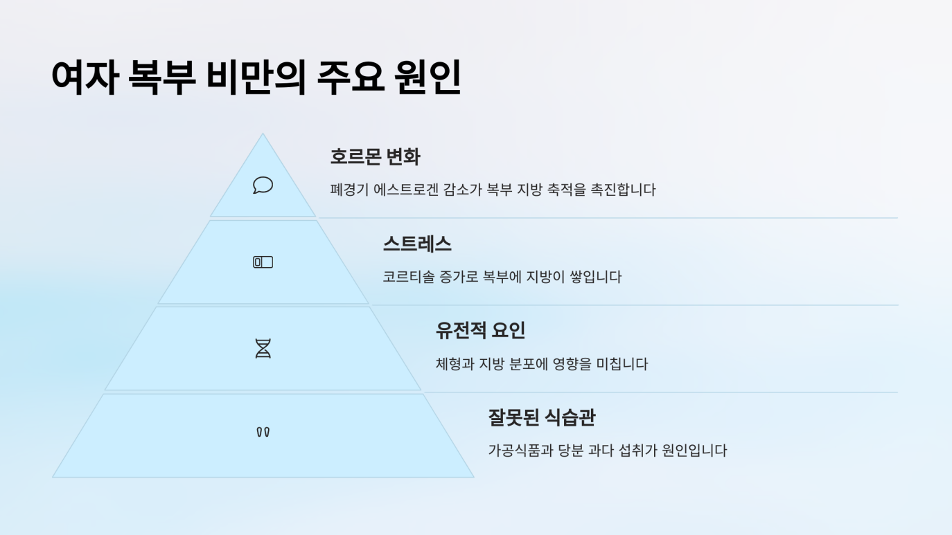 사무직 종사자나 가사, 육아로 바쁜 여성들은 체계적으로 운동할 시간을 내기 어렵습니다. 또한 나이가 들수록 기초대사량이 감소하기 때문에, 평소보다 식사량을 줄여도 체중이 늘 수 있습니다. 운동 부족은 근육량이 줄어들게 만들어 지방 연소 효율이 떨어지고, 결국 복부비만을 심화시킵니다.