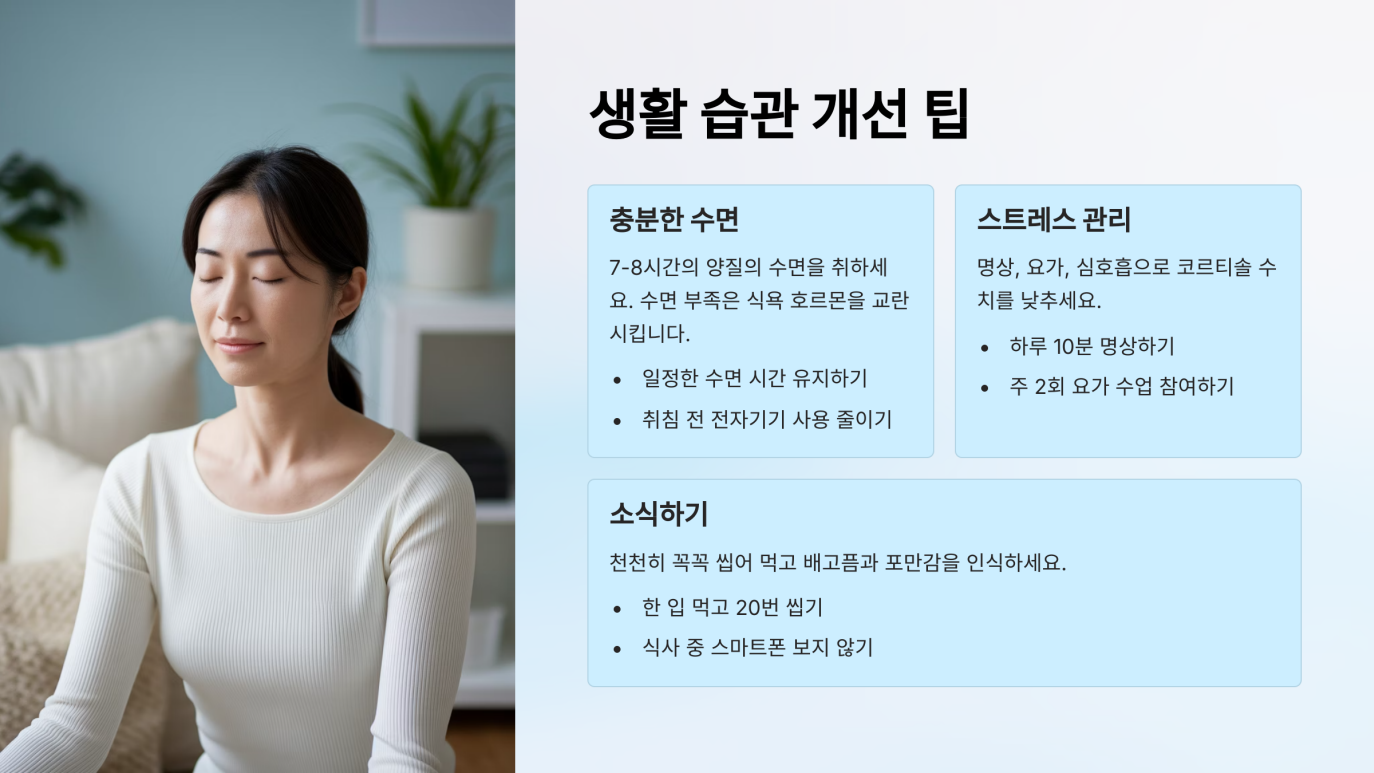 스트레스가 많으면 코티솔 호르몬 분비가 증가하는데, 이 호르몬은 지방을 복부에 축적하도록 만듭니다. 또한 수면이 부족하면 식욕 조절 호르몬(그렐린, 렙틴 등)이 불균형을 일으켜 과식을 유발할 수 있습니다. 잦은 야근, 불규칙한 생활 패턴도 복부비만을 악화시키므로, 규칙적인 수면 습관이 매우 중요합니다.