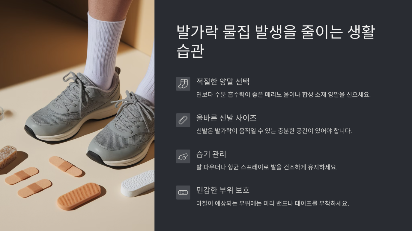 - 발 위생 불량: 발을 자주 씻지 않거나 땀을 잘 제거하지 않으면 피부가 약해져 물집 위험이 커집니다.