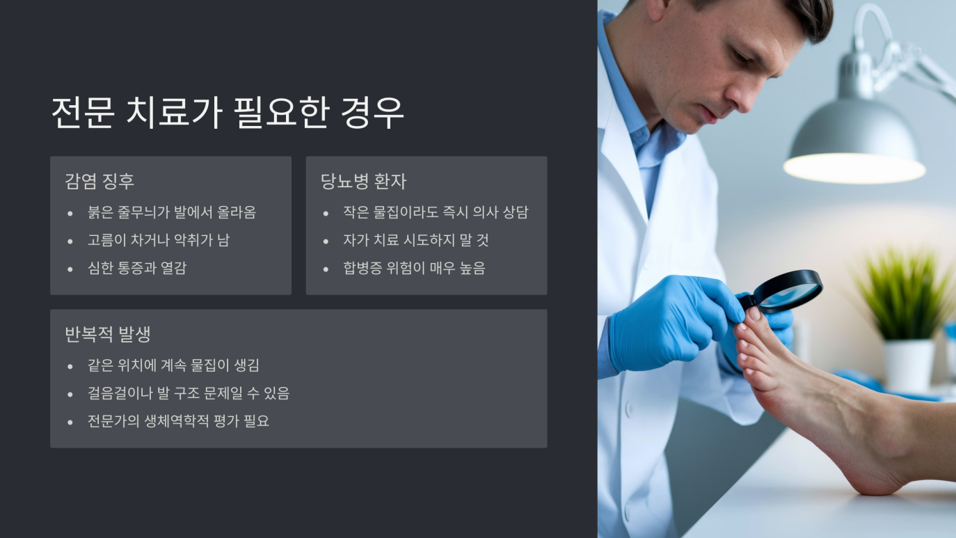 - 만성 재발: 꾸준히 관리해도 자주 물집이 생긴다면 발 변형, 잘못된 걸음걸이, 신발 등의 구조적 문제가 있을 수 있습니다.