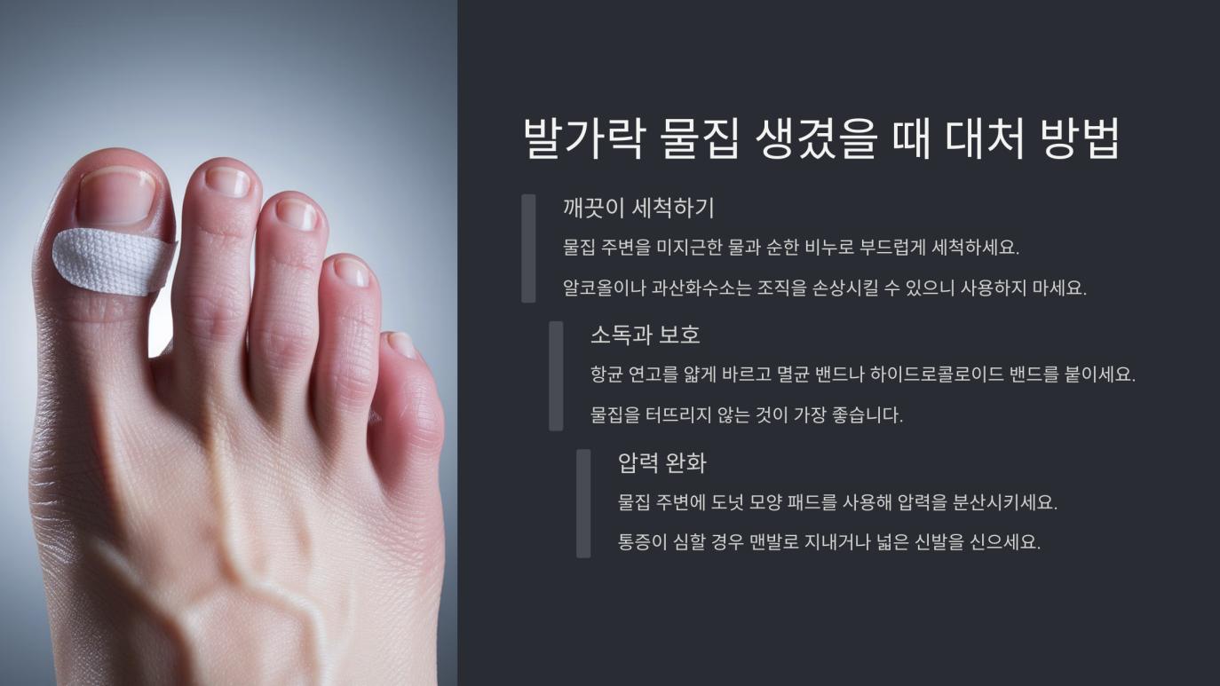 발가락 물집 생겼을때 신속하고 올바른 대처를 하는 것은 통증 완화와 2차 감염 방지를 위해 매우 중요합니다. 불편한 신발, 과도한 신체 활동, 발 위생 관리 소홀 등의 요인으로 물집이 생기기 쉬우며, 물집이 생긴 후에는 무엇보다 청결 유지와 압박 완화에 집중해야 합니다.