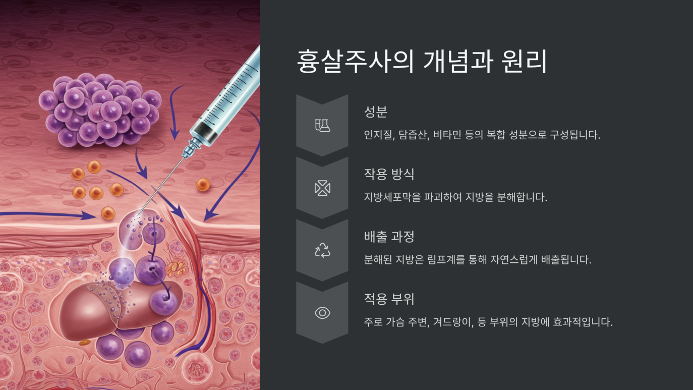 흉살주사란, 지방·흉살 조직이나 주위 조직의 부피나 형태를 개선하기 위해 주사 형태의 약물을 해당 부위에 주입하는 시술을 말합니다. 원래는 흉터 조직 완화나 유착된 흉살을 풀어주기 위해 개발된 의료적 목적으로 시작되었으나, 점차 미용 목적으로도 응용 범위가 확대되었습니다.