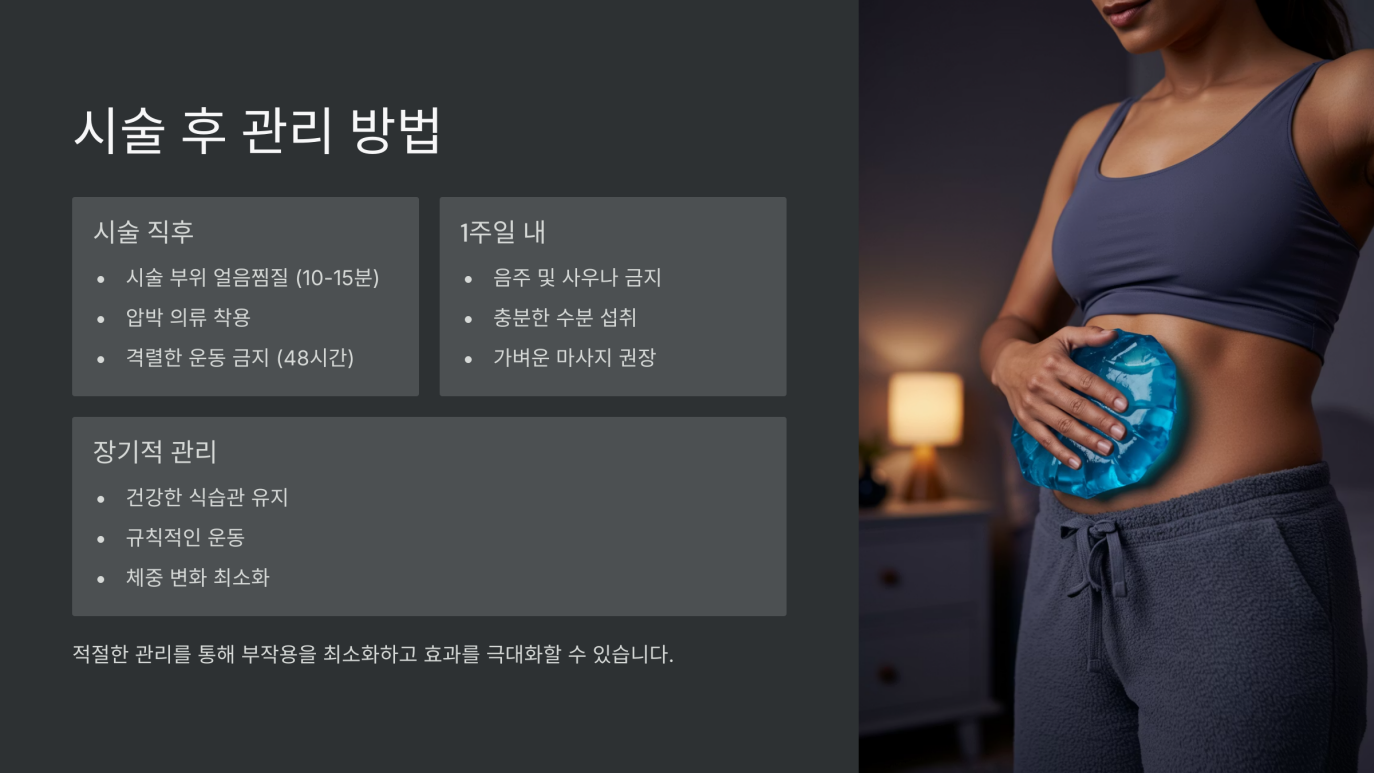 시술 부위가 아직 안정화되지 않았을 수 있으므로, 꽉 끼는 속옷이나 강한 마사지는 피하는 것이 좋습니다. - 적절한 냉찜질
