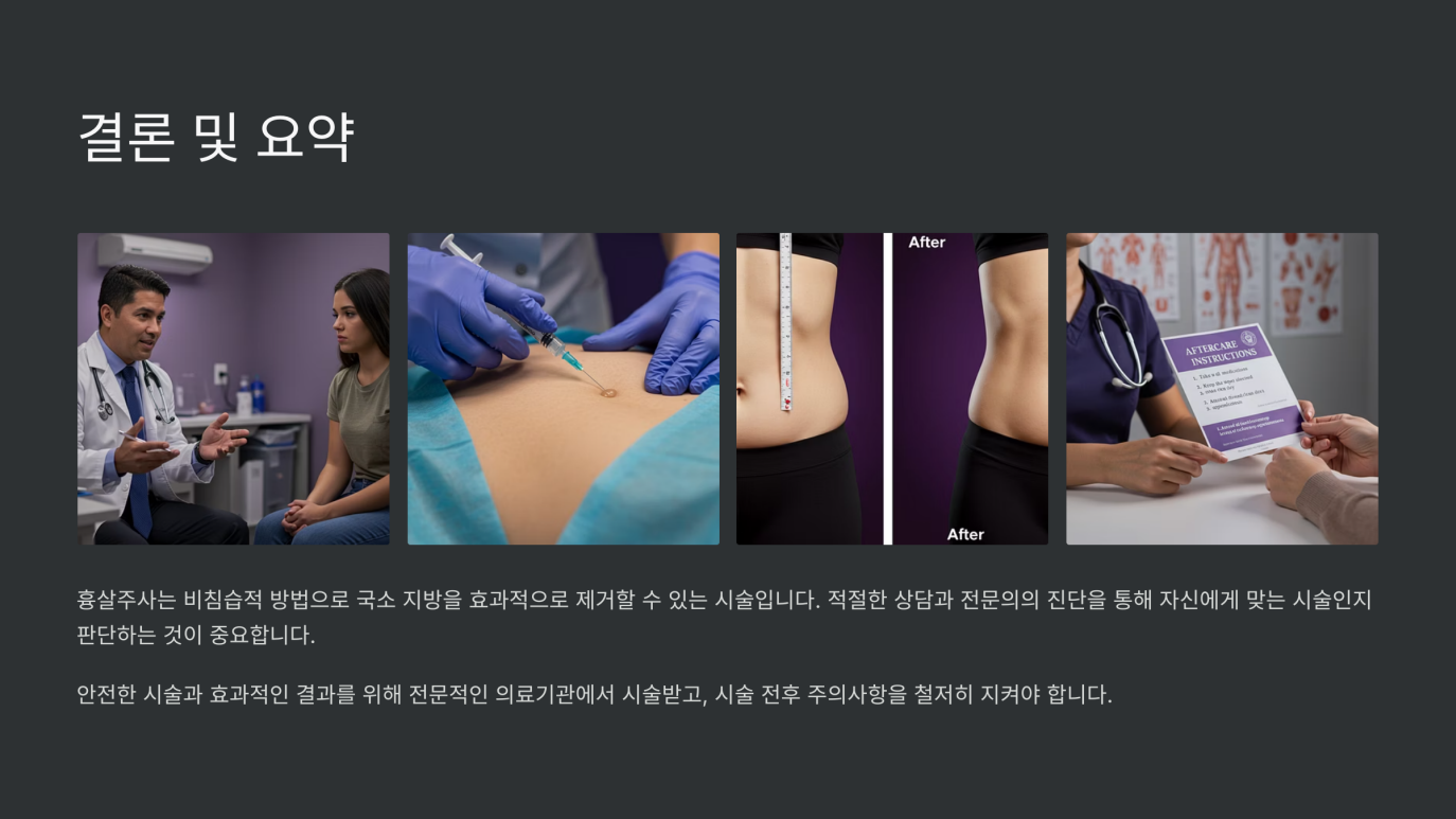 흉살주사는 가슴 부위나 수술 후 발생한 흉살·유착 조직을 개선하고, 조직을 부드럽게 만들어주는 효과가 있습니다. 시술 과정은 비교적 간단하고 회복 속도도 빠르지만, 시술 전후 주의사항을 철저히 지키고, 숙련된 의료진을 통해 시술받는 것이 중요합니다.