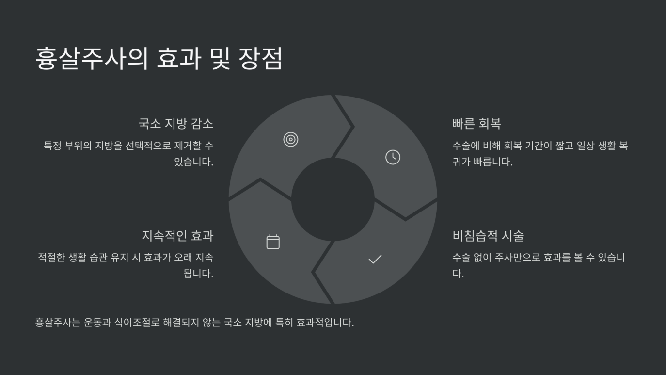 1) 비수술적 시술이라는 점: 흉살주사는 칼을 대지 않고도 조직 개선이 가능해, 회복 기간이 짧습니다.