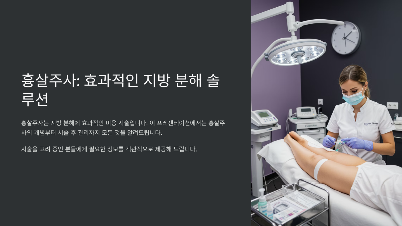 - 메조테라피(Mesotherapy): 주로 피하지방층에 미량의 약물을 주입하여 셀룰라이트를 개선하거나, 지방을 분해하는 것을 목표로 합니다. 흉살주사와 비슷하나, 주로 바디 셀룰라이트 개선에 사용되는 편입니다.