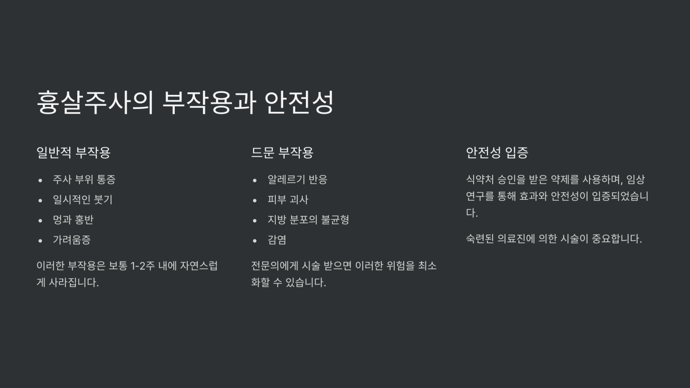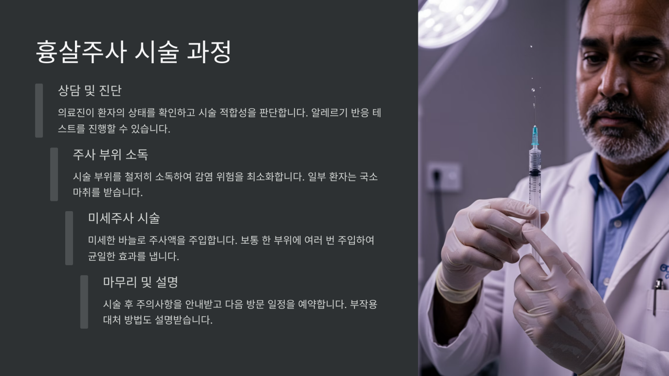 무엇보다 흉살주사는 목적과 기대 효과를 분명히 하고, 전문의와의 상담을 통해 개인 맞춤 시술 계획을 세우는 것이 성공적인 결과의 핵심입니다.