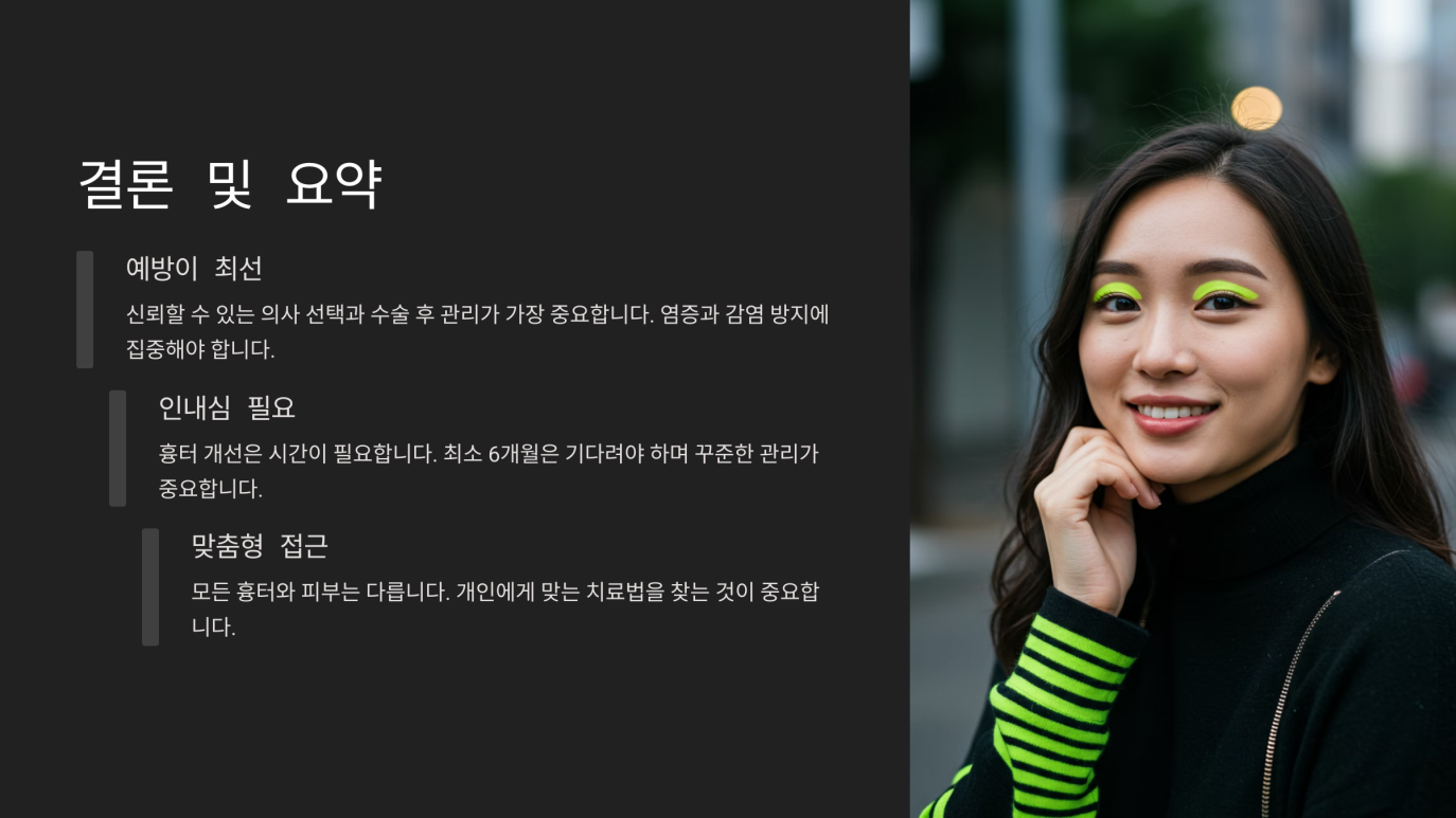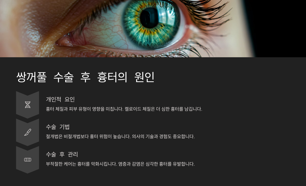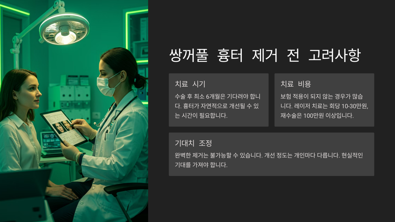 비수술적 방법은 흉살 정도가 경미하거나, 수술적 제거를 하기엔 부담스러운 상황일 때 고려됩니다. 특히 ‘쌍수 흉살 제거’라는 키워드만 보고 무조건 재수술을 결정하기보다, 피부과적 또는 비침습적 치료도 큰 도움을 줄 수 있으니 상황에 맞춰 선택하는 것이 좋습니다.