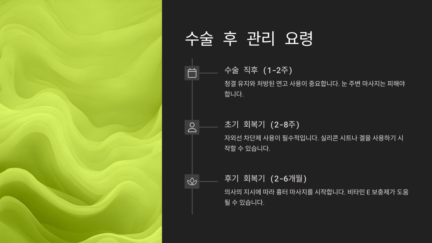 - 수술 후 초기 관리(안정, 냉·온찜질, 흉터 연고 등)만 잘해도 흉살 형성을 크게 줄일 수 있으니, 본인 노력도 매우 중요하다는 점을 기억하세요.