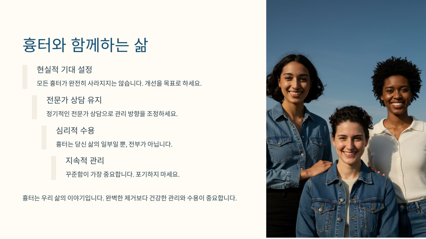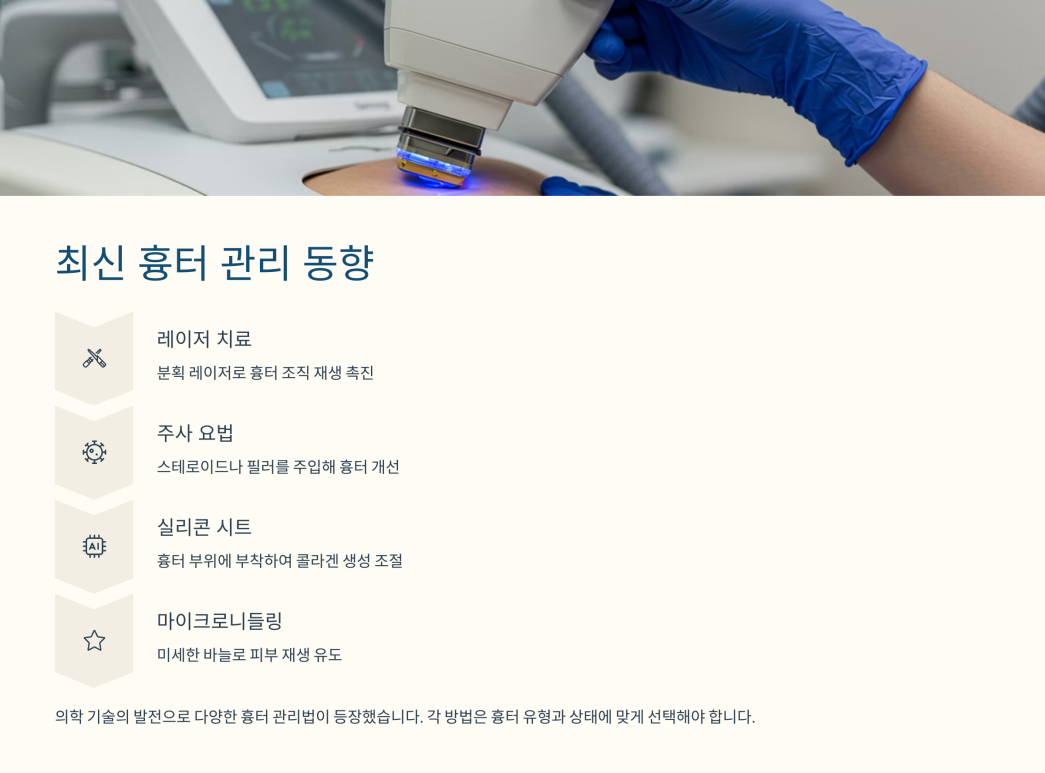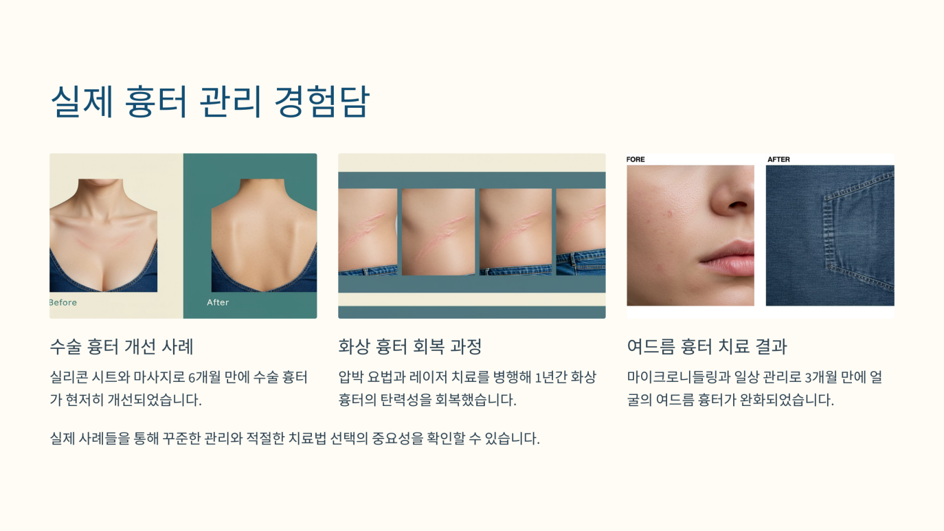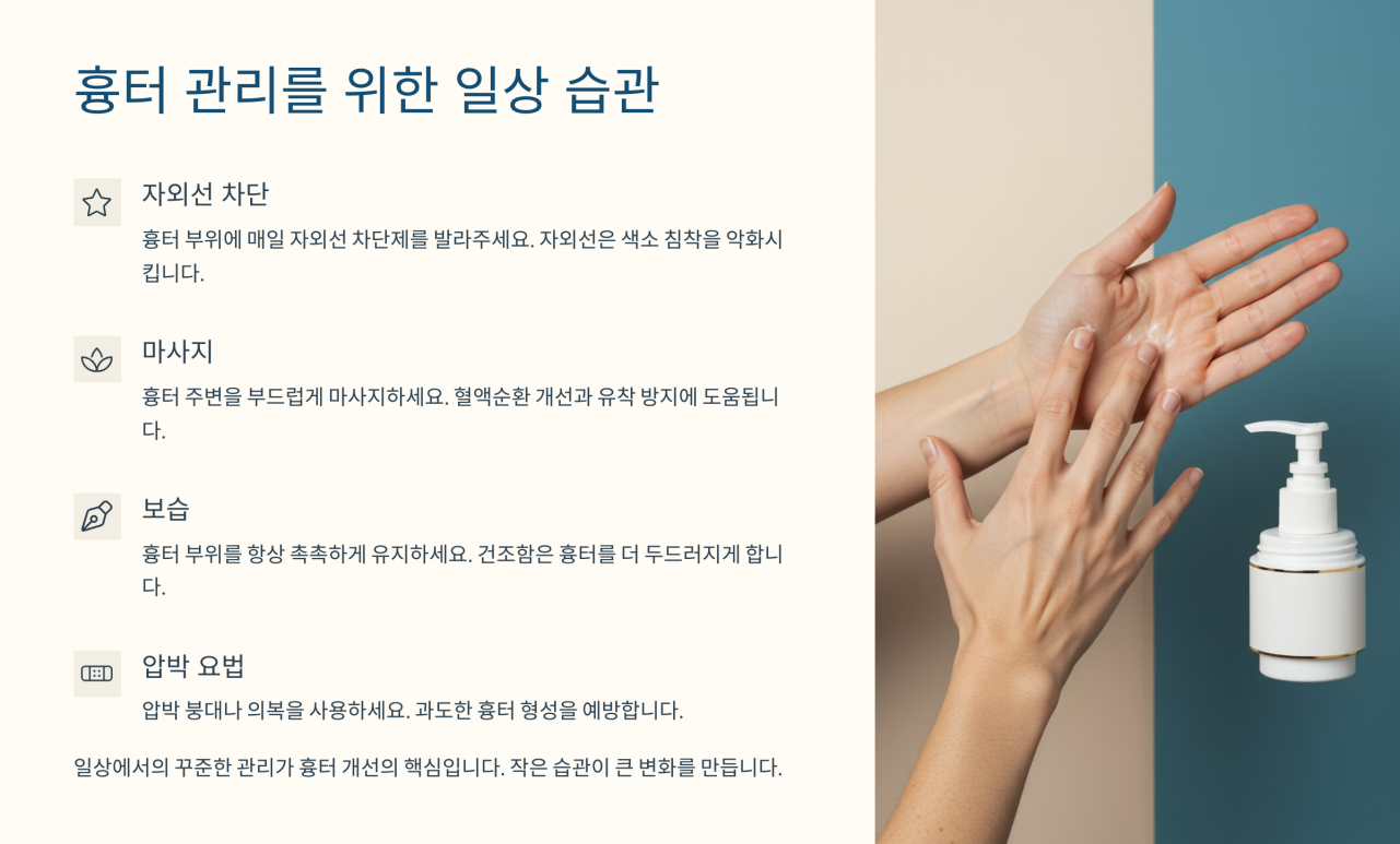 이러한 접근법은 개인의 흉터 상태와 체질에 따라 다르게 적용되며, 정기적으로 전문의와 상의해가며 조정해 나가는 것이 핵심입니다.