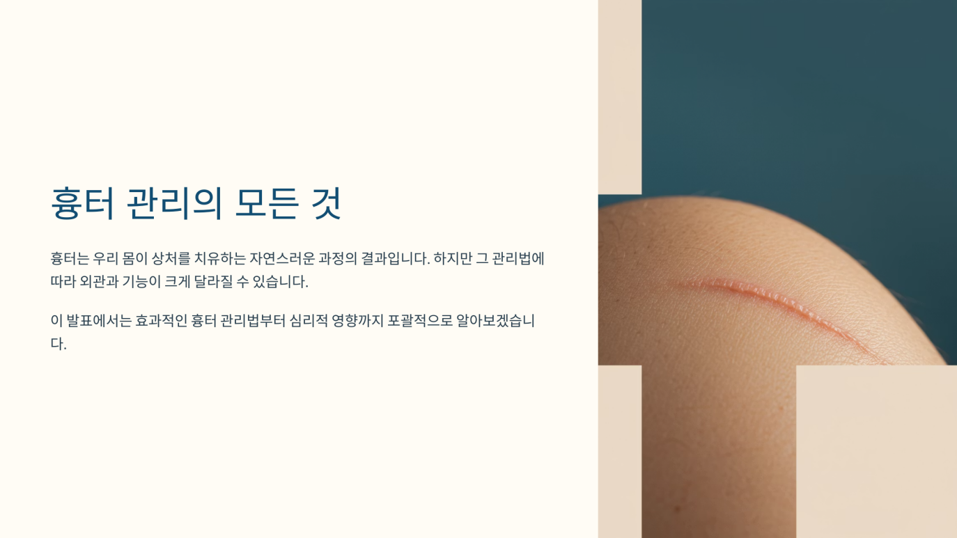 안녕하세요. 오늘은 흉살 관리에 대해 깊이 있는 정보를 나누어 보려고 합니다. 수술 또는 외상으로 생긴 흉터는 단순히 외적인 문제만은 아닙니다. 자신감, 일상생활, 심리 상태 등 다양한 측면에 영향을 미칠 수 있습니다. 흉살(흉터 조직)이 두꺼워지거나 보기 좋지 않게 변형되면 회복 단계에서부터 적극적인 흉살 관리가 필요한 이유이기도 합니다. 하지만 흉터는 종류도 다양하고, 사람마다 피부 상태나 회복 속도가 다르기 때문에 체계적인 접근이 중요합니다. 이 글에서는 2025년 최신 동향과 함께 구체적인 흉터 케어 방법, 주의사항, 그리고 실질적인 노하우를 폭넓게 다루어 보겠습니다.