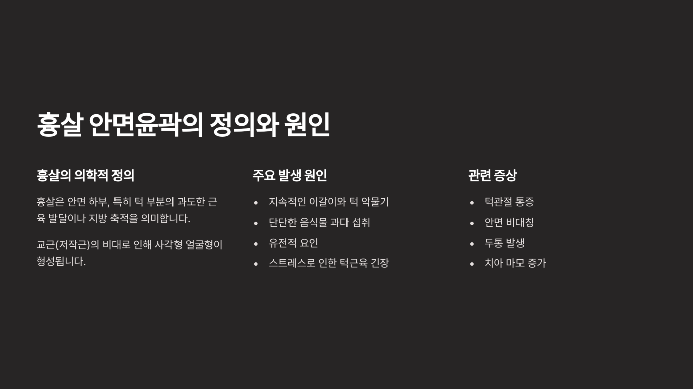 흉살이란 조직이 손상되면서 생기는 흉터 조직을 의미합니다. 수술이나 상처 후 회복 과정에서 새로운 조직이 생성되는데, 이때 피부나 근막 등에 섬유화가 발생해 딱딱하게 만져지는 부분이 생길 수 있습니다. 흉살 안면윤곽의 경우, 턱뼈나 광대뼈 등을 깎는 안면윤곽 수술 이후에 생긴 흉터 조직을 효과적으로 개선하고, 자연스러운 윤곽을 되찾는 데 집중하는 개념이라 할 수 있습니다.