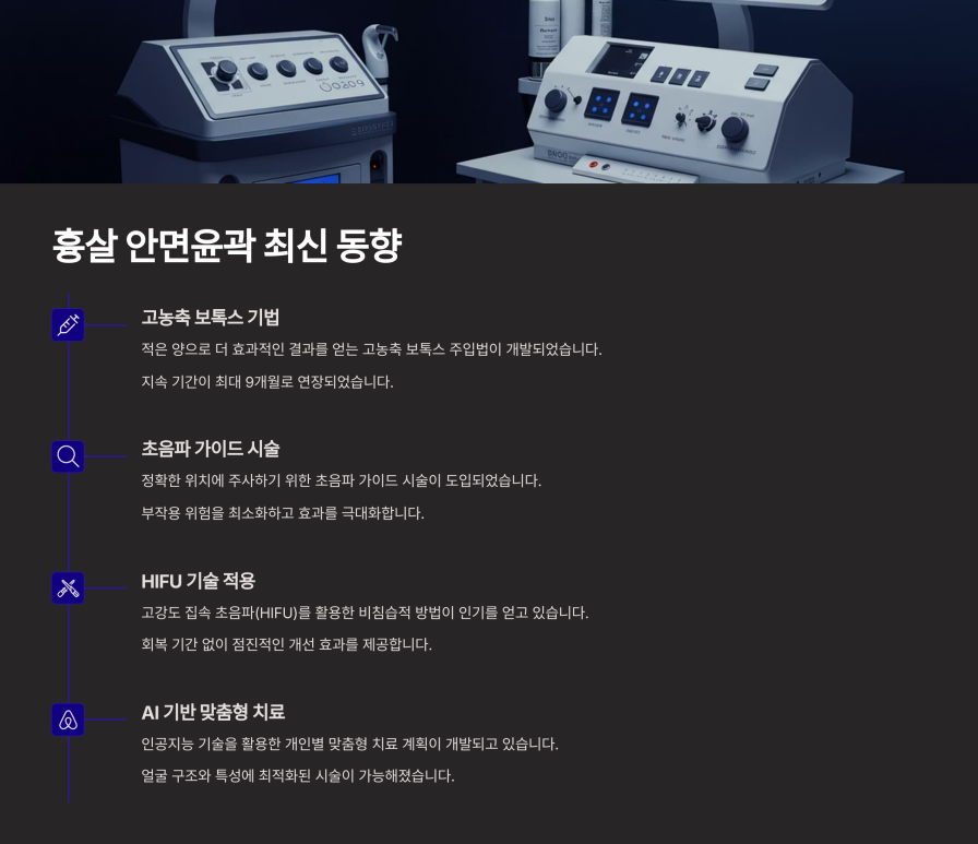 안면윤곽에 특화된 레이저 장비, 고주파 기기, 초음파 기기, 주사요법 등이 다양한 방식으로 진화하고 있습니다. 이를 종합적으로 활용해, 개개인의 흉살 상태에 맞는 맞춤형 프로그램이 제공되는 추세입니다. 예컨대 레이저와 주사, 마사지 요법을 혼합해 사용하는 ‘멀티 모달리티’ 접근법이 대표적인 예시입니다.