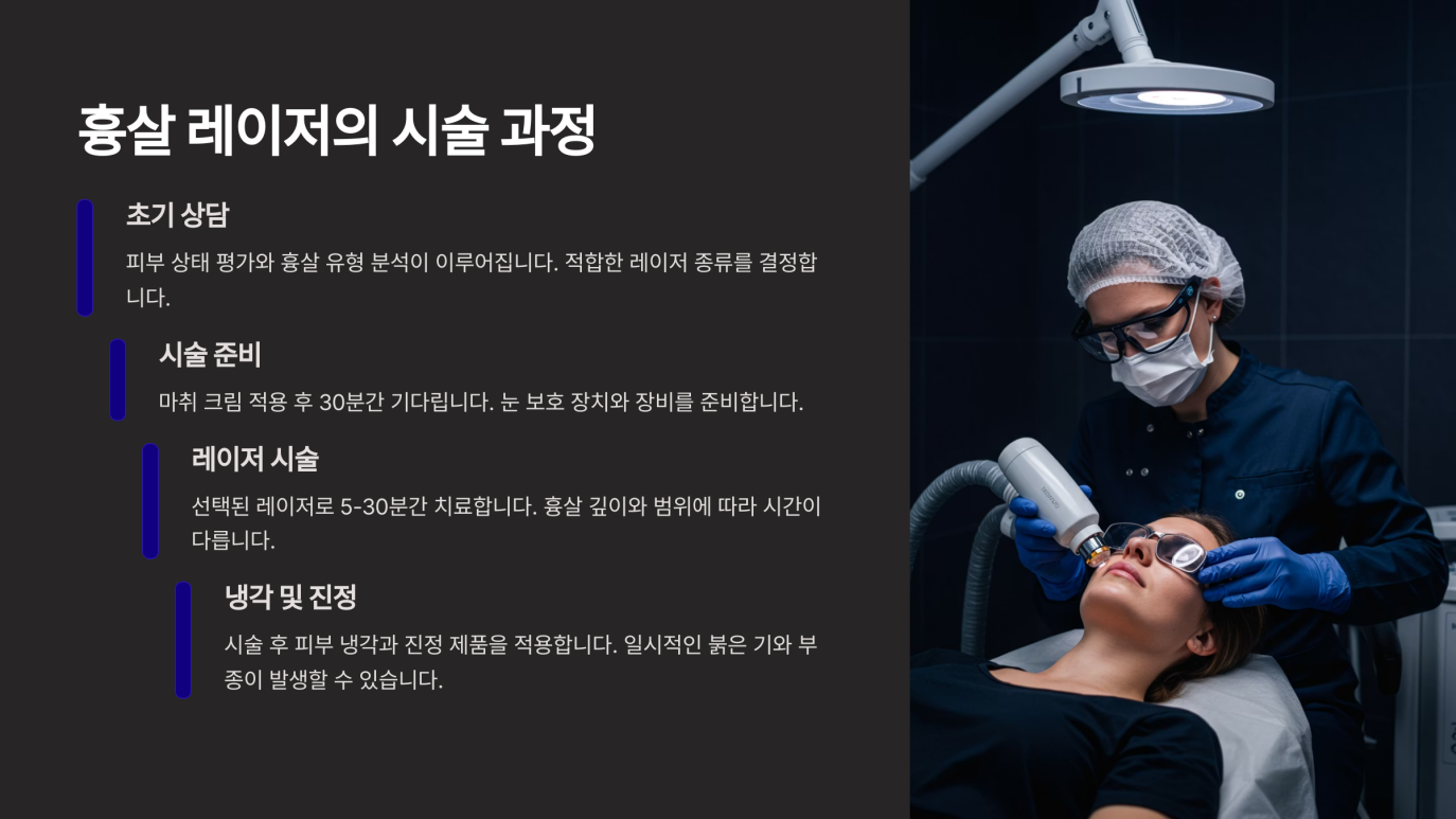 - 레이저 조사: 선택된 레이저 기기를 활용해 흉살 부위에 레이저 에너지를 조사