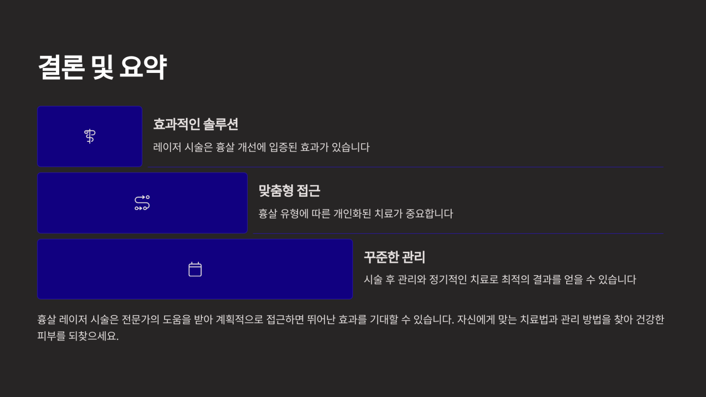 이러한 사후 관리를 잘 지킬수록 흉살 레이저의 효과를 극대화할 수 있습니다. 또, 개인 체질에 따라 시술 횟수나 주기가 달라질 수 있으므로 반드시 의료진과의 상담을 통해 맞춤형 관리 계획을 세우는 것이 좋습니다.