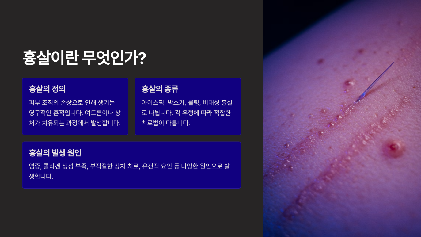 - 레이저 흡수: 특정 파장의 레이저가 피부에 조사되면, 과다 증식된 흉살 조직이 레이저 에너지를 흡수