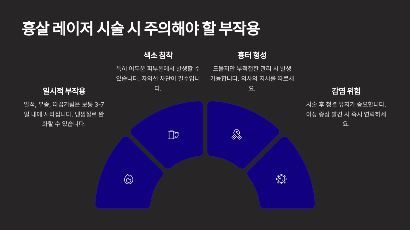 흉살 레이저 치료는 비교적 안전하다고 알려져 있지만, 일부 사람에게서는 예상치 못한 부작용이 발생할 수 있습니다. 대표적으로 다음과 같은 문제들이 보고됩니다.