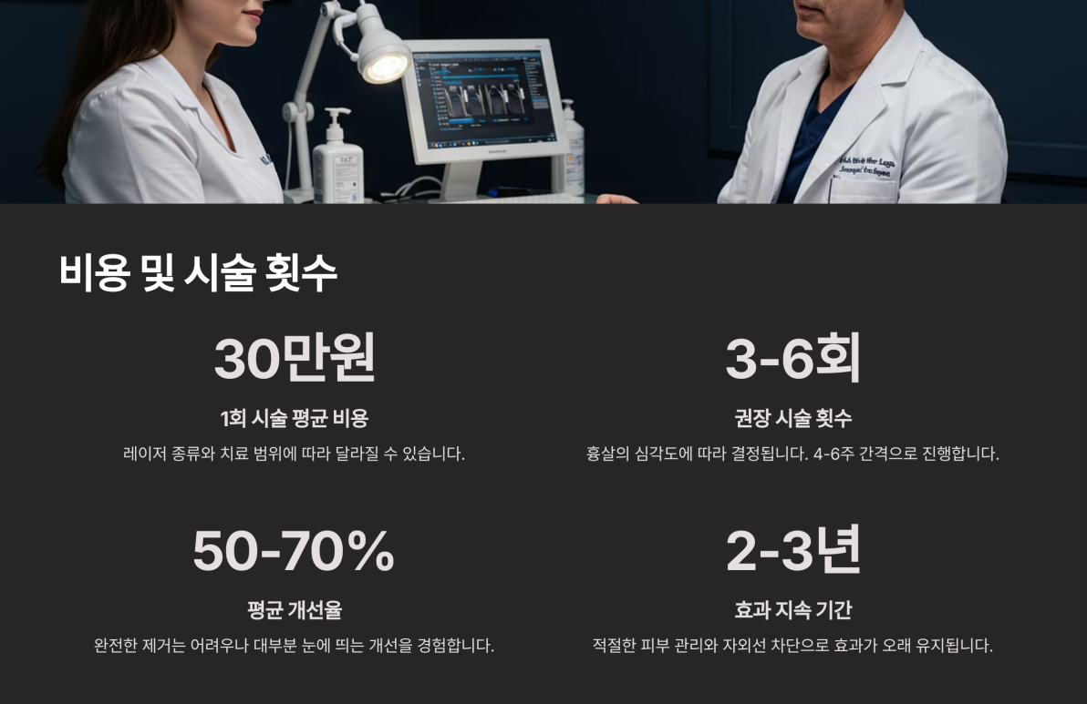 만약 시술 후 통증이 심해지거나 상처 부위에 계속적인 염증 반응이 나타난다면 즉시 의료진과 상의해야 합니다. 개인별 피부 상태와 흉살 정도에 따라 부작용 발생률이나 종류가 달라질 수 있으므로, 시술 전 충분한 상담과 준비가 중요합니다.