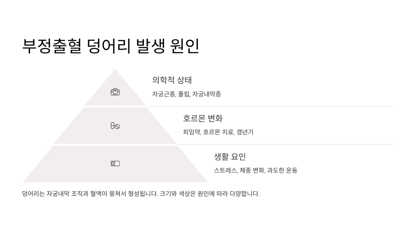 호르몬 불균형으로 인한 부정출혈은 비교적 흔하나, 지속적으로 덩어리 출혈이 동반된다면 다른 기저 질환은 없는지 확인해야 합니다.