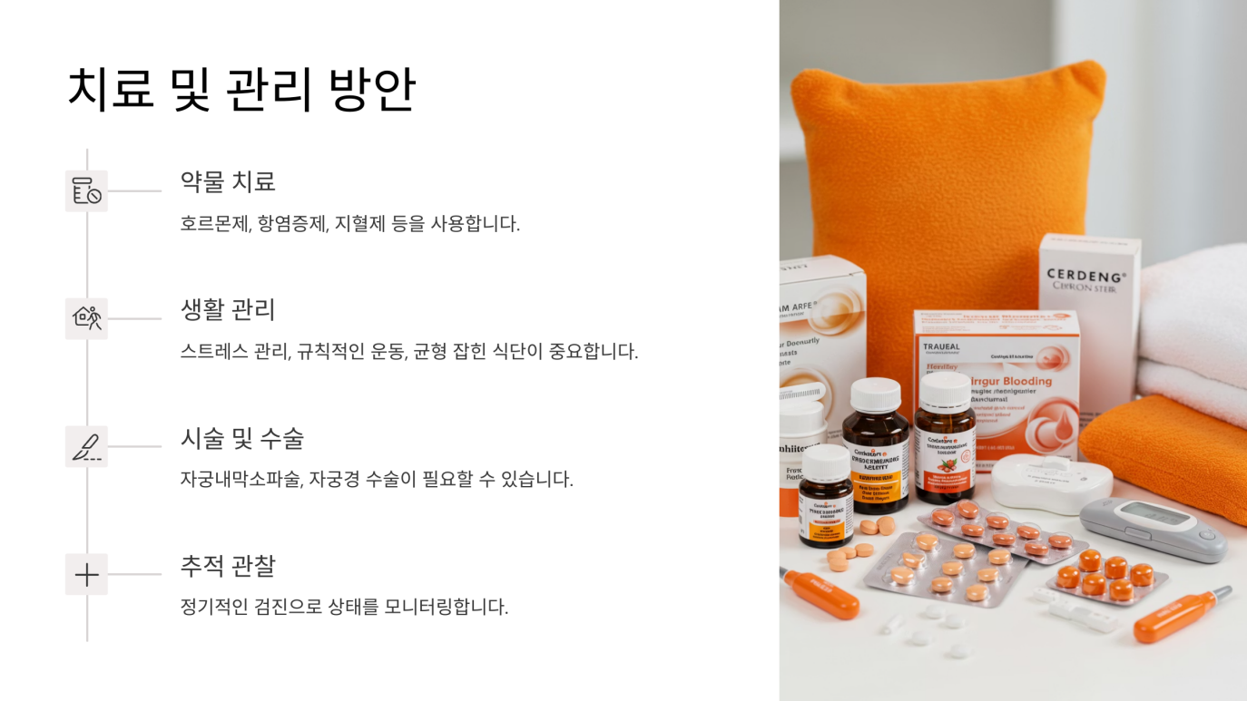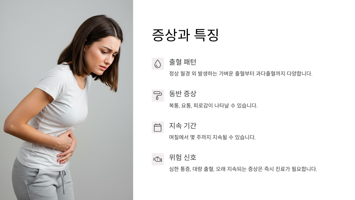 이를 위해 산부인과 진료 및 초음파 검사, 호르몬 검사, 필요한 경우 조직검사까지 받아보는 것이 안전합니다. 더불어 치료 과정에서는 호르몬 제제, 지혈제, 항생제 같은 약물 치료부터 자궁근종 제거, 자궁내막 소작술 등 수술적 접근까지 다양한 방법이 고려될 수 있습니다. 가장 중요한 것은 조기 발견과 적절한 대응이며, 이를 위해 정기 검진과 생활습관 개선이 필수적입니다.