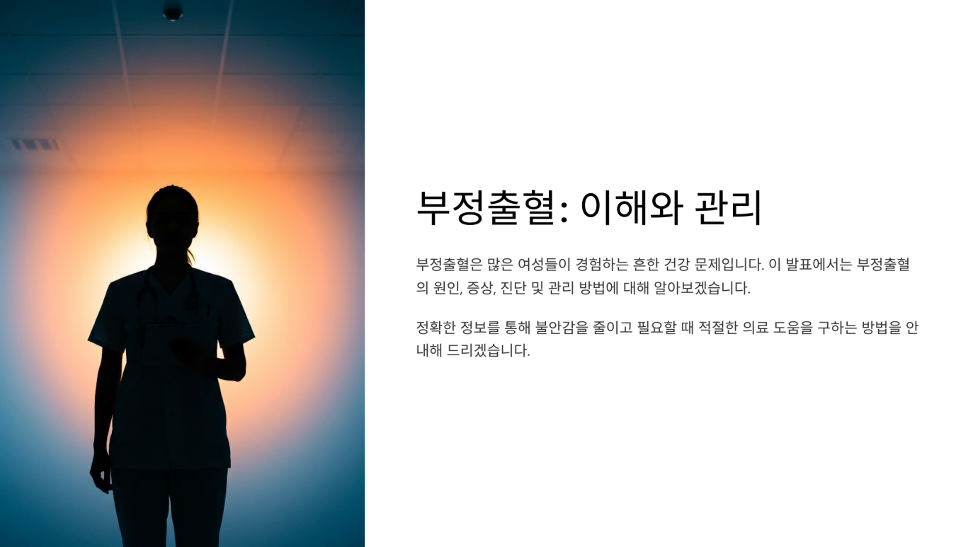 - AI 기반 예측 모델: 과거 검진 기록과 호르몬 수치, 생활습관 데이터를 통합하여, 부정출혈 위험도를 사전에 분석·예측하는 모델이 개발되고 있습니다. 이는 조기 진단과 예방에 큰 도움을 줍니다.