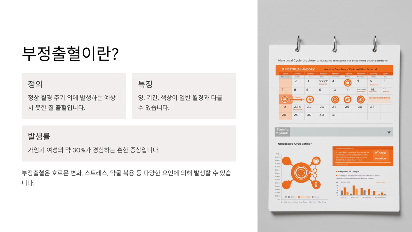 여성이라면 평생 여러 차례 생리 주기를 겪게 됩니다. 그런데 정상적인 생리와 달리 예기치 못한 시기에 출혈이 발생하거나, 평소 생리 양상과 다른 모습으로 “부정출혈 덩어리”가 나와 당황스러움을 느끼는 경우가 종종 있습니다. 이러한 증상은 때로는 단순 호르몬 이상이나 스트레스 때문일 수도 있지만, 때로는 자궁이나 난소 질환과 관련이 있을 수도 있어 주의가 필요합니다.
