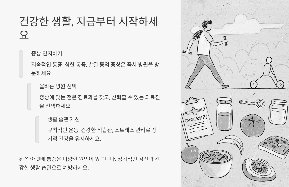 “왼쪽 아랫배 통증 병원”을 선택할 때는 소화기내과, 산부인과, 비뇨기과 등 분야별 협진 체계가 잘 갖춰져 있는지, 필요한 검사 장비가 구비되어 있는지, 의료진의 전문성이 높은지 등을 꼼꼼히 살피면 좋습니다. 또한 기본적인 생활 습관 개선과 함께 전문의와의 상담을 병행함으로써 조기 발견과 조기 치료의 기회를 놓치지 않길 바랍니다.