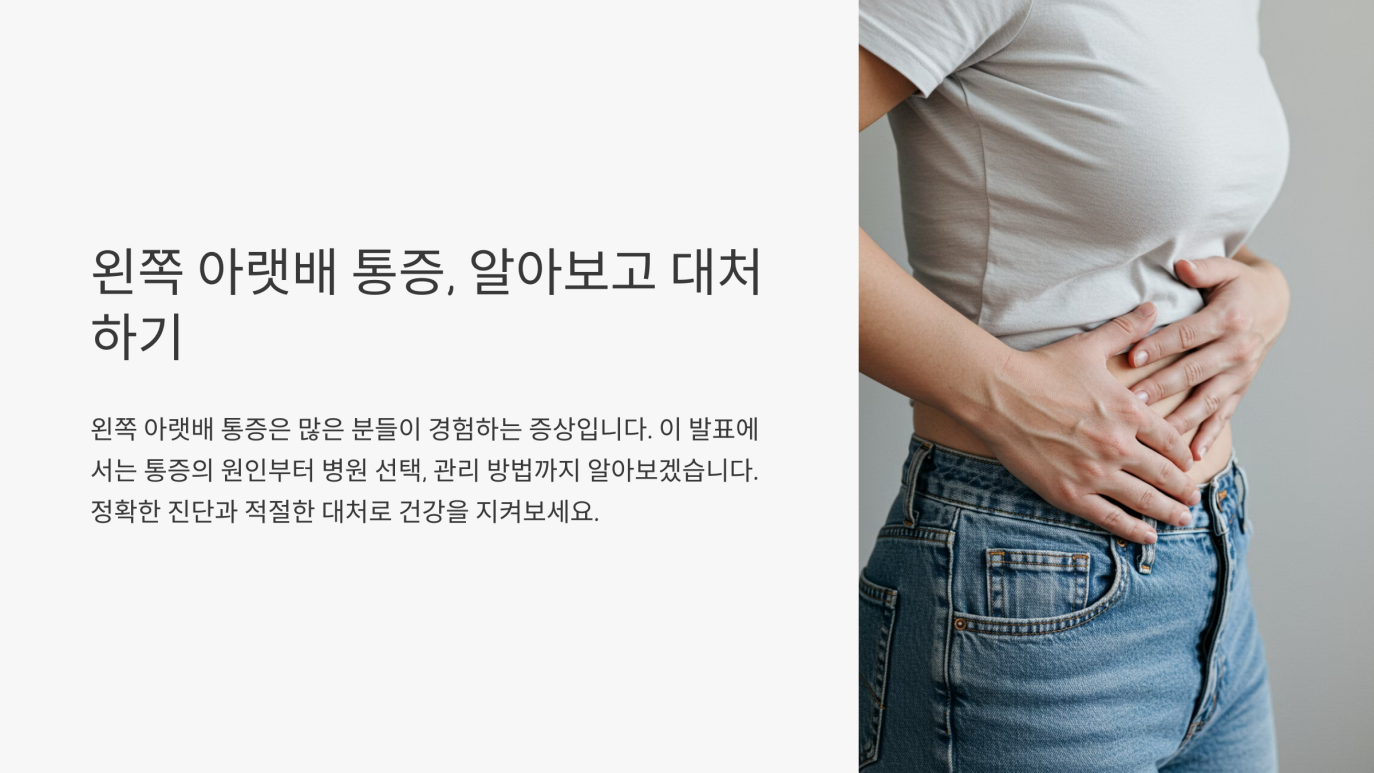 왼쪽 아랫배 통증은 과민성 대장 증후군처럼 비교적 가벼운 문제에서, 대장암, 요로결석, 난소 질환 등 심각한 질환까지 폭넓은 원인 가능성을 지니고 있습니다. 통증 양상을 유심히 관찰하고, 전문 병원에서 적절한 검사를 받아야만 정확한 진단과 치료가 가능합니다. 특히 통증이 지속적이거나 점점 심해지는 양상을 보일 때, 혹은 다른 증상(혈변, 발열, 구토, 생리 주기와 무관한 통증 등)이 동반된다면 지체 없이 병원을 찾아가셔야 합니다.