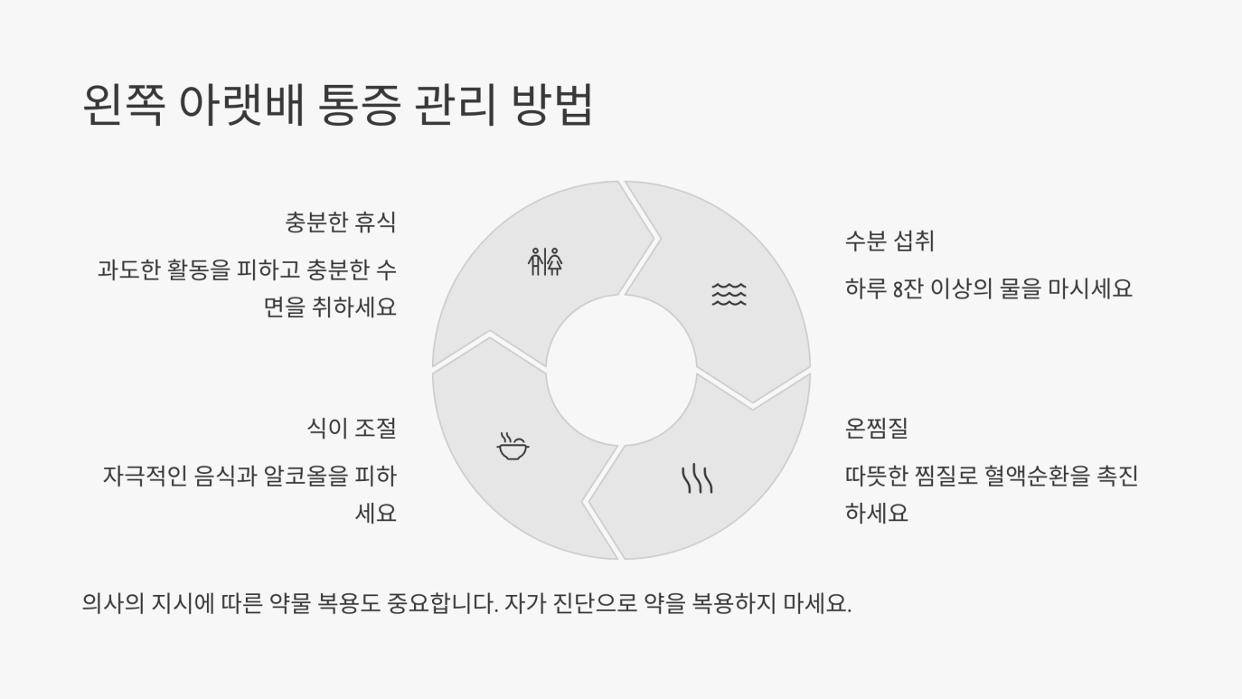 진단을 받기 전후로 통증 완화를 위해 스스로 할 수 있는 관리 방법들이 있습니다. 물론 이는 임시 방편일 수 있으며, 근본적인 원인 치료를 위해서는 언제든지 “왼쪽 아랫배 통증 병원”을 방문해 전문적인 상담을 받아야 합니다.