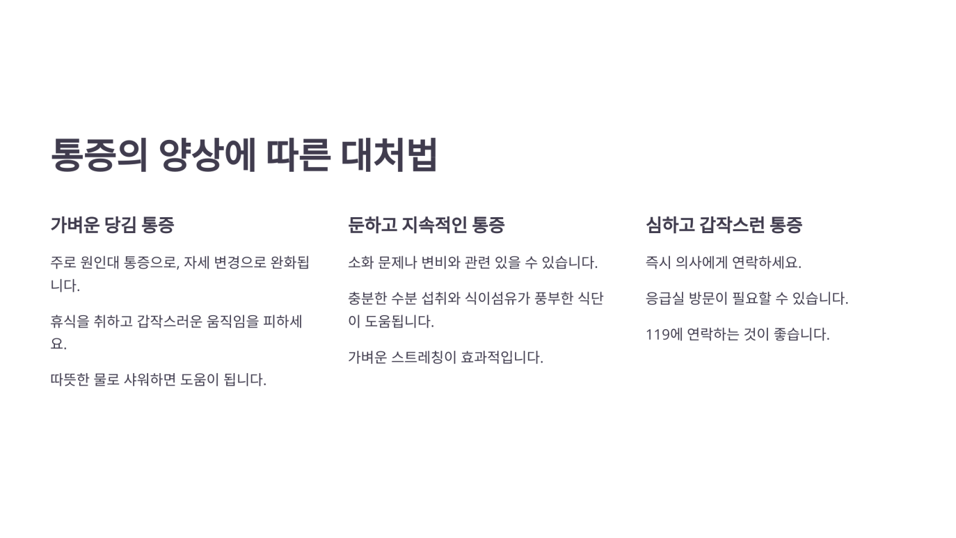 - 통증 양상과 동반 증상을 꼼꼼히 기록: 통증이 언제, 어떻게 발생했는지, 다른 증상(출혈, 발열, 구토 등)은 없는지 살피세요.