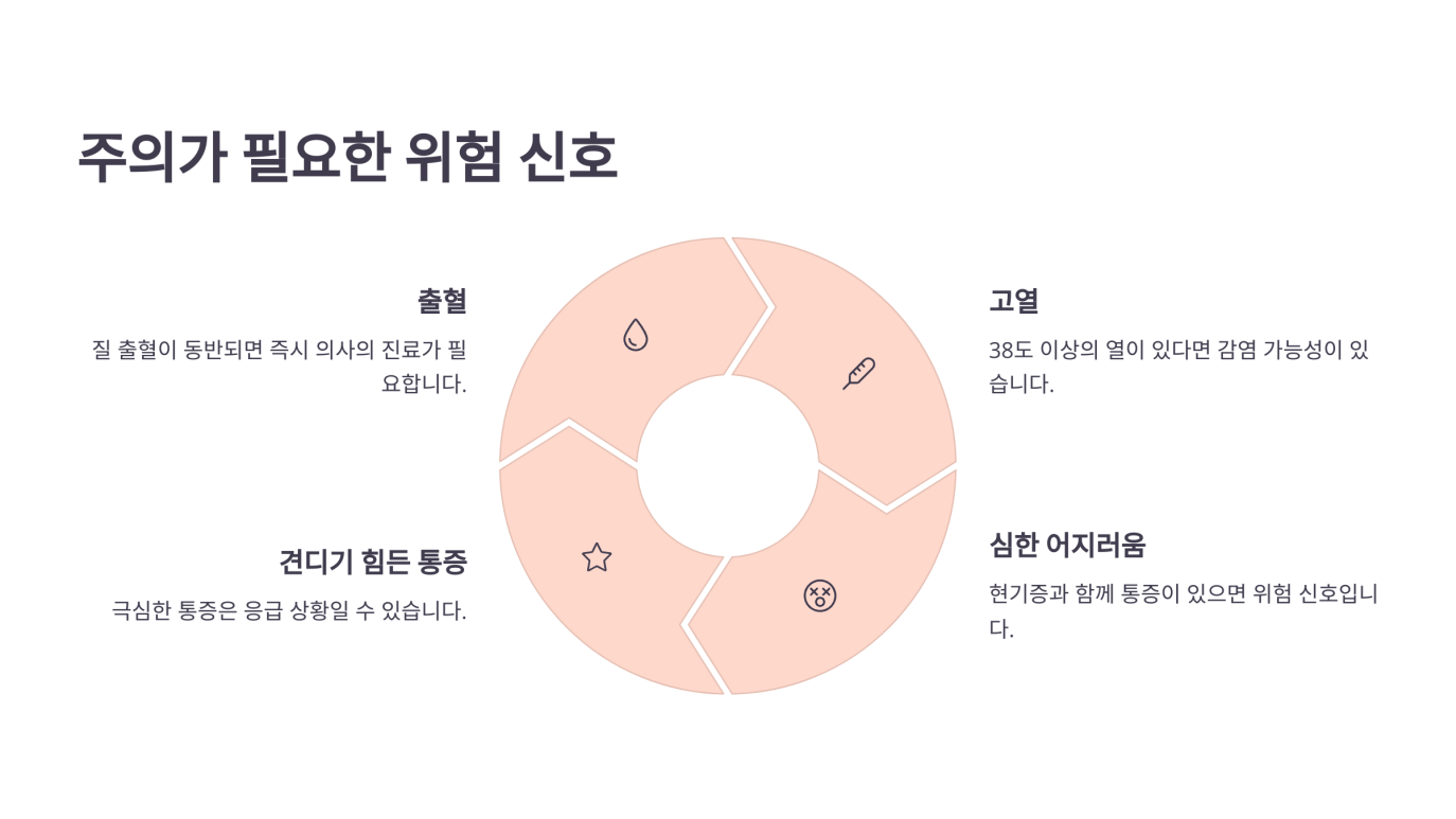 - 전문의 상담: 통증이 지속되거나 강도가 심해지면 지체 말고 산부인과나 관련 과 전문의에게 진단을 받으세요.